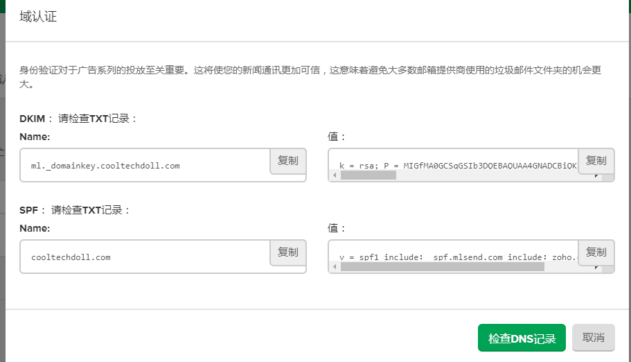 如果点击“检查DNS记录” ,出现错误的话会红色提示,按照错误提示修改即可。如果按我说的改了还有问题,就找EDM服务商咨询设置。