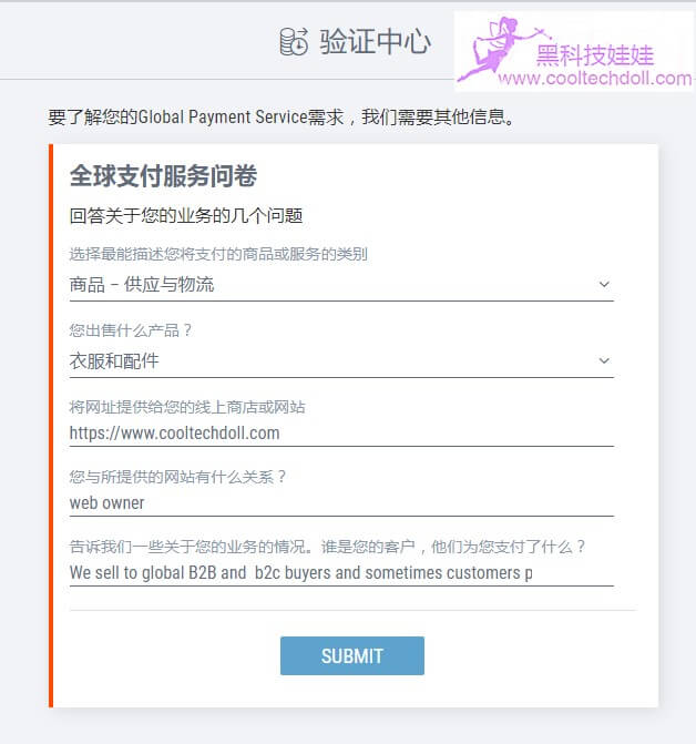 注意这一步必不可少,因为线下直接收款(不是从电商平台打款的),如果累计加起来达到了一定金额,就会触发风控审核,P卡会邮件要求您补充资料,这是对你账户和资金来源的必要审核步骤,所以预先填完问卷就不用后面触发风控的时候再填写了。