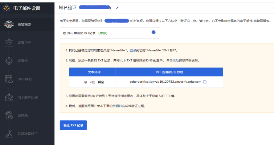 在托管摘要里会自动识别你的NS地址,它会提示四种域名验证的方法,四选一即可,这里一般推荐TXT方法。
