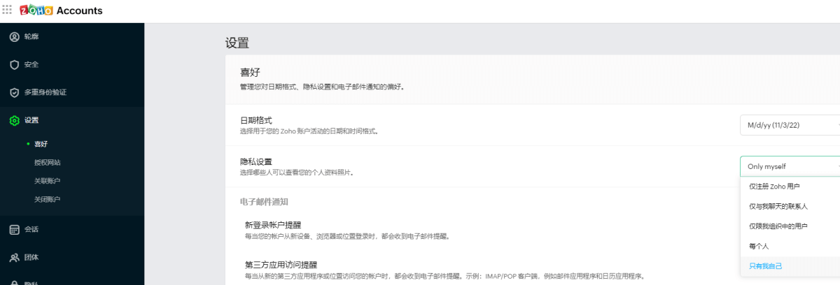 点击邮箱右上角的头像,将鼠标悬停在头像上,然后单击更改,将重定向至你的的“Zoho 帐户”页面,然后你可以在“帐户”页面上,单击个人信息里的头像,从计算机中上传图像文件。